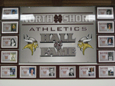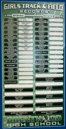 Plaques and Such now offers our take on full color Display Signs and Record Boards. Display Signs are the perfect compliment to the Wall Plaques in your Athletic and Academic Hall of Fame display. Commemorate superior Athletic and Academic achievements with display products such as Swimming Record Boards, Football Strength Training Boards or Track and Field Record Boards. These custom Record Boards are equipped with the ability to easily change out a previous record holder with our replacement qualification plates. Also we supply you with our hanging bracket system included free. Our boards are made with High Density Gatorfoam Board. Please browse our template catalog for Record Board design ideas or contact us for more details.